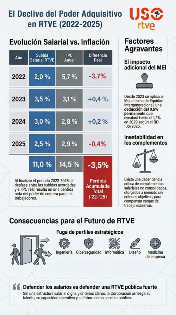 Defender los derechos salariales de los trabajadores es defender una RTVE pública fuerte. Sin salarios dignos, sin poder adquisitivo y sin criterios claros, RTVE pierde talento, capacidad y futuro.