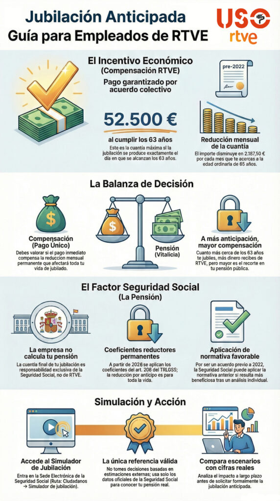 Os informamos sobre los puntos clave del acuerdo colectivo vigente en RTVE relativo a la jubilación anticipada con derecho a compensación: