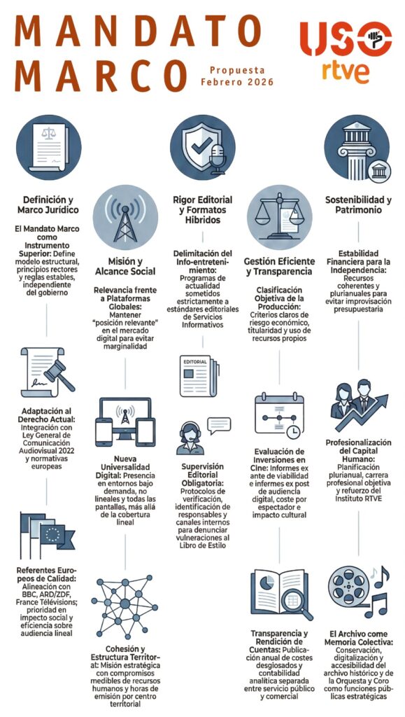 Compromiso territorial y humano: El mandato debe obligar a fijar recursos humanos mínimos y horas de emisión específicas para cada estructura territorial. Para los trabajadores, se exige una planificación plurianual de RR.HH, una carrera profesional objetiva y el refuerzo de la formación a través del Instituto RTVE.