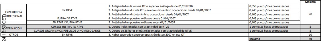 Se considerarán los cursos de 25 horas o más realizados por Organismos públicos y homologados que tengan relación con la actividad de RTVE. 1 punto por cada 25 horas de formación, prorrateándose a razón de 0,04 puntos las horas que excedan de 25.  Máximo 5 puntos. Estos cursos deberán ser acreditados mediante:
