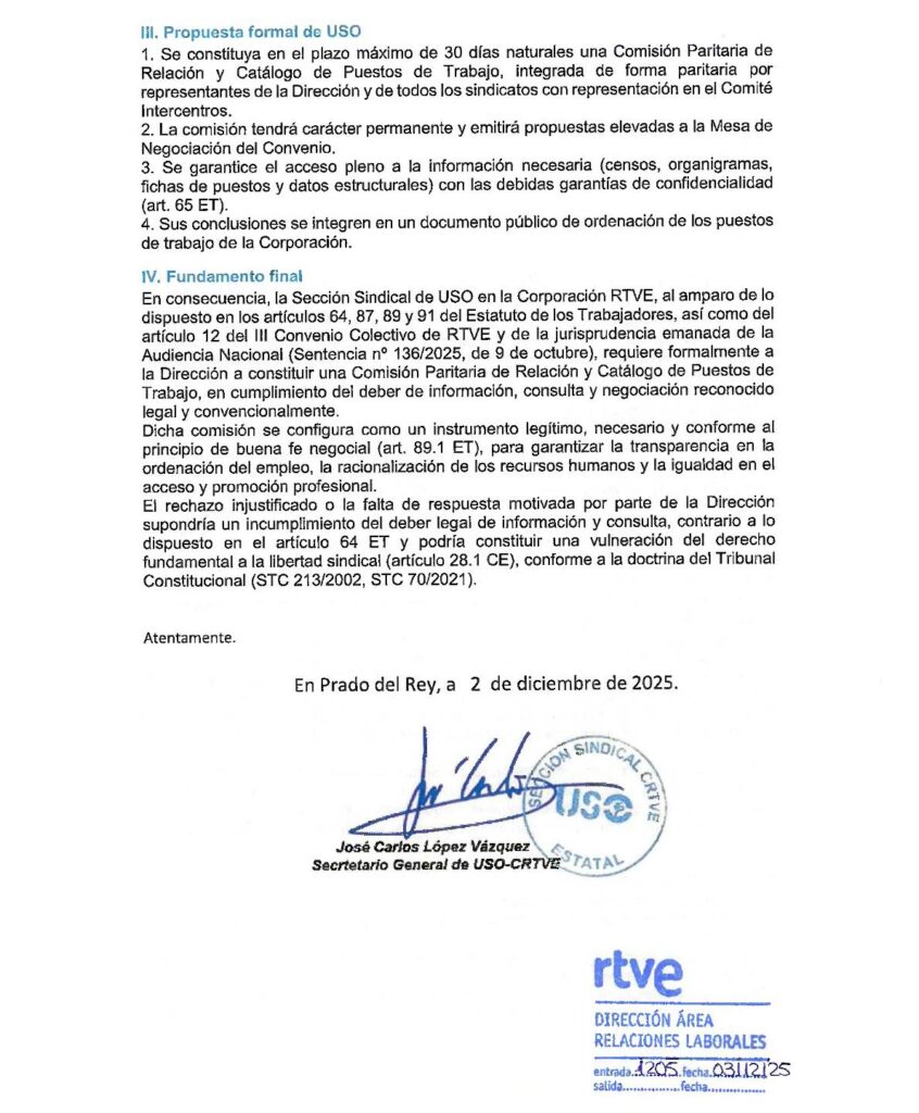 La Sección Sindical de USO en la Corporación RTVE ha registrado ante la Dirección una propuesta formal para crear una Comisión Paritaria sobre el Catálogo de Puestos de Trabajo.