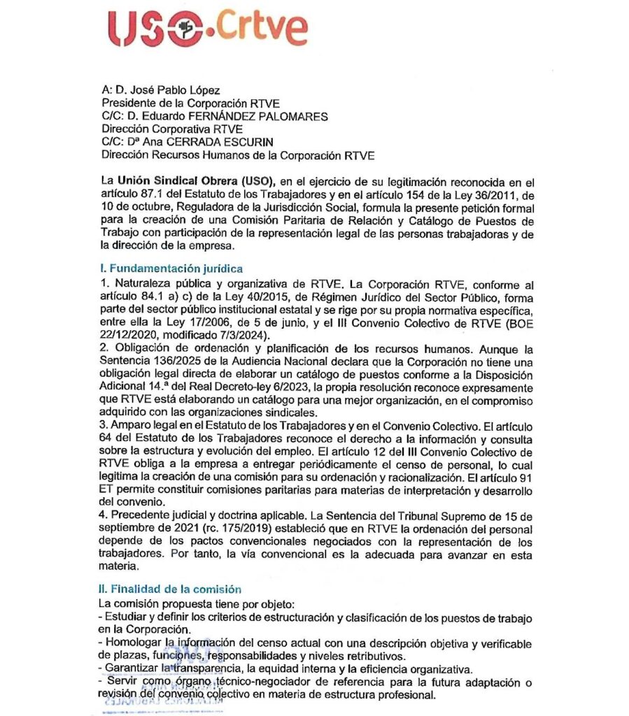 La Sección Sindical de USO en la Corporación RTVE ha registrado ante la Dirección una propuesta formal para crear una Comisión Paritaria sobre el Catálogo de Puestos de Trabajo.
